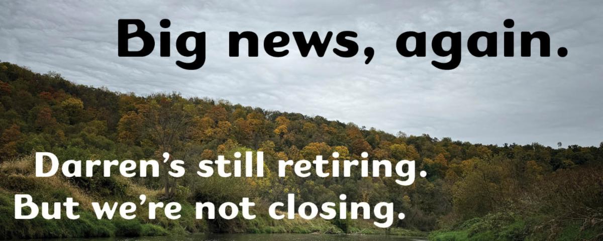 We're still having a retirement sale to get inventory lower for the winter. Please feel free to keep coming in!