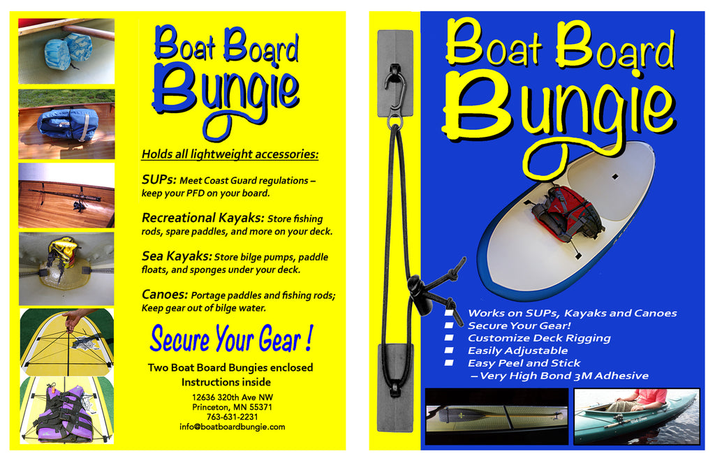 The Boat Board Bungie is a system of self-adhesive cleats, adjustable elastic cords, and quick-release hooks. Boat Board Bungie is used to secure lightweight paddling accessories inside a canoe, kayak, or SUP so those objects can be quickly portaged along with the boat. Boat Board Bungie is great for organizing gear so the items you need most are always close at hand.