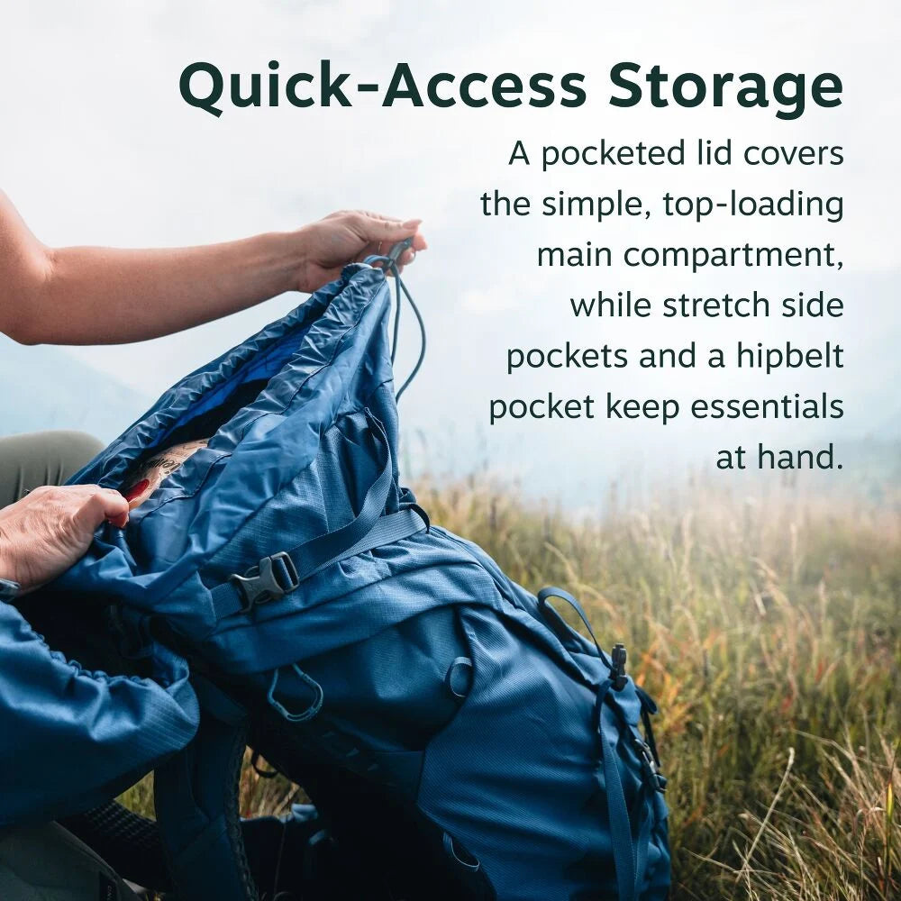A pocketed lid covers the simple, top-loading main compartment, while stretch side pockets and hipbelt pockets keep essentials at hand.